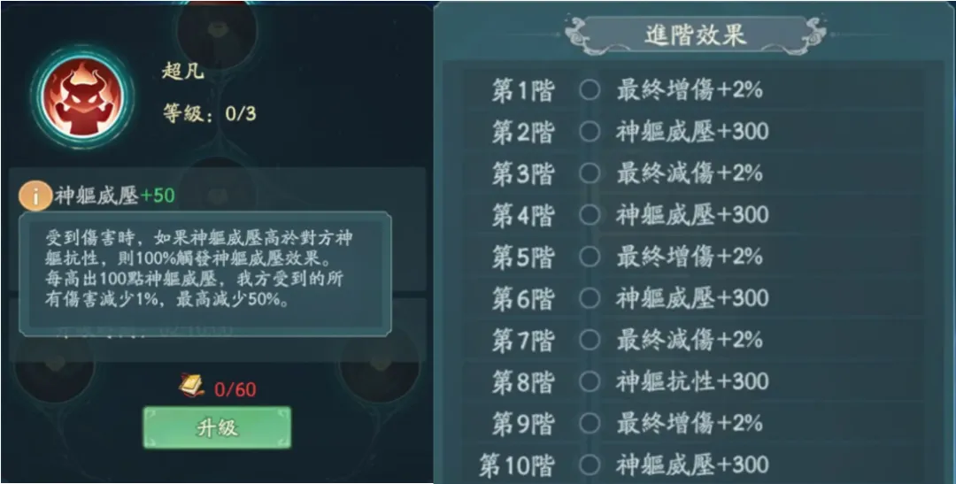 ②假设我方神躯威压1000点,对面神躯抗性500点,那么我方受到的所有伤害都会额外降低5%(非最终减伤,而是计算完增减伤之后的最终伤害降低)!