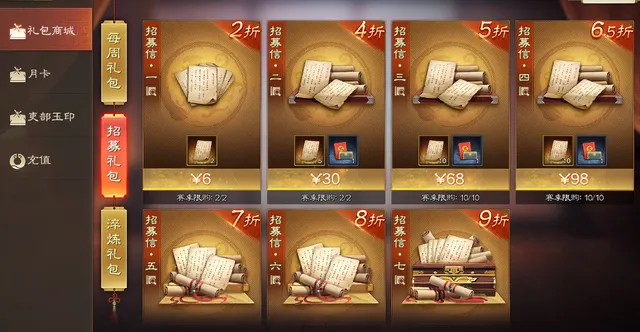 参考礼包商城里面的招募信折扣,可以看出98元之前的都在5折以下,6元的甚至达到了2折(直播间的还要给多2个名刺)),因此如果你本身就准备充钱抽卡,那么在直播间购买这些礼包还是比较划算的,不打算充钱的可以忽略。