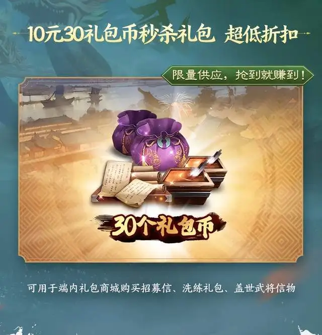 另外一个也算是比较有性价比的礼包是这个10元30礼包币的活动,基本等于10元充30元。