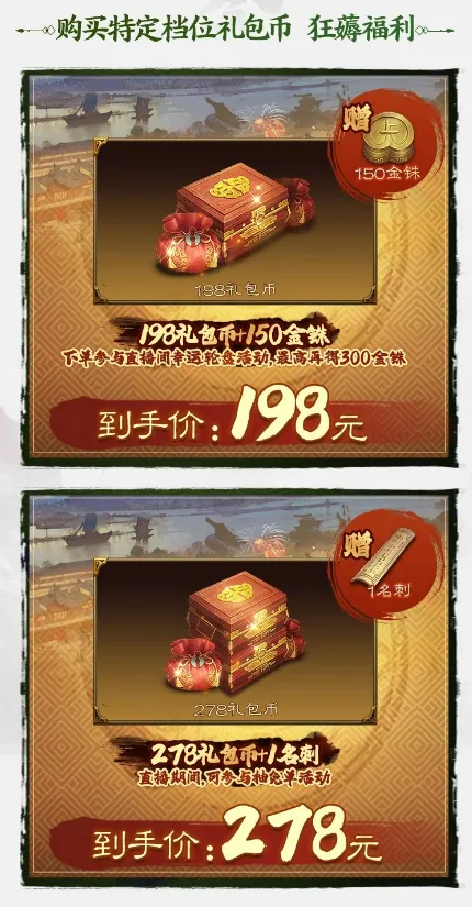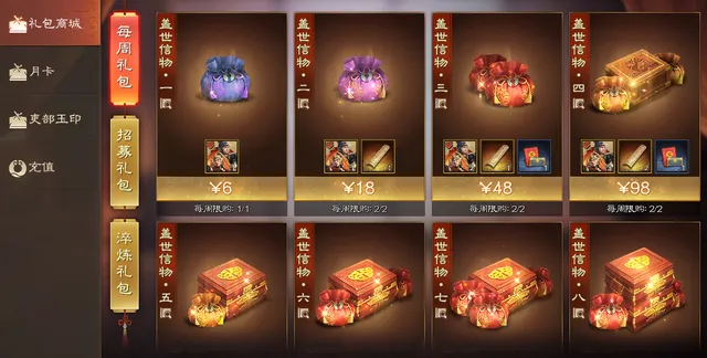 其他档位的礼包币基本没有性价比,原价只送一点金铢或者名刺,完全可以忽略。