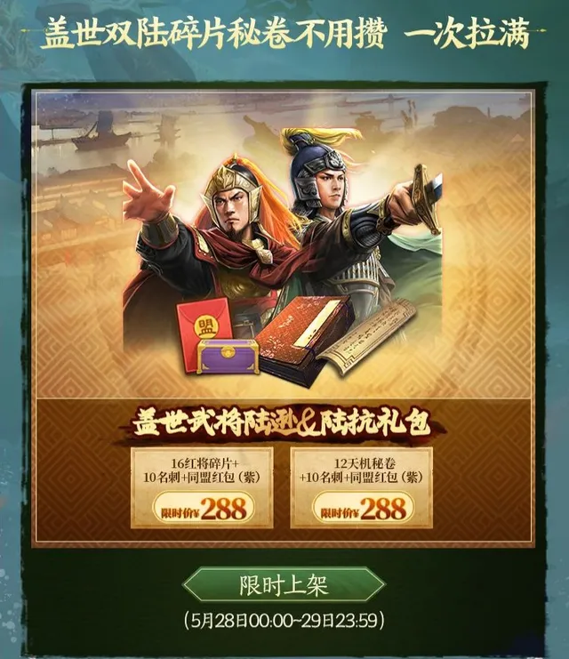 另外还有两点需要注意的,第一个是每个档位的折扣分别限购2次,第二个是只有在5月28日-29日18:00-22:00期间才可以购买,错过这个时间段,礼包就下架了。
