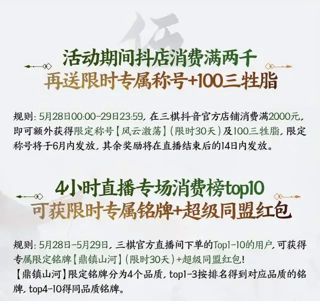 适合大哥的活动,与和绝大多数人没有关系,消费满2000元送限定称号+100三牲脂,消费排行榜TOP10还给限定铭牌和超级同盟红包。