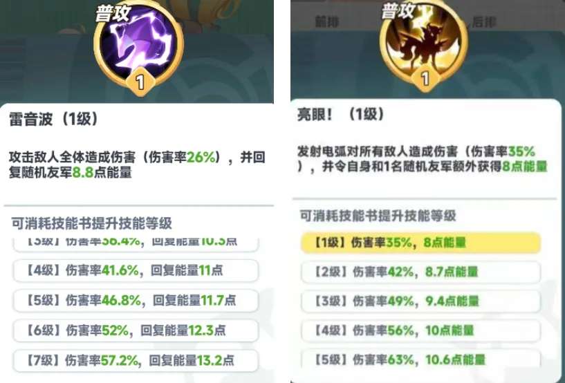 电羊的一级普攻伤害率26%回能8.8,而托托普攻伤害率35%回能8,可以看出托托的普攻回能数值是不如电羊的,但是取而代之的是伤害率的提高和自身也能享受额外的回复。
