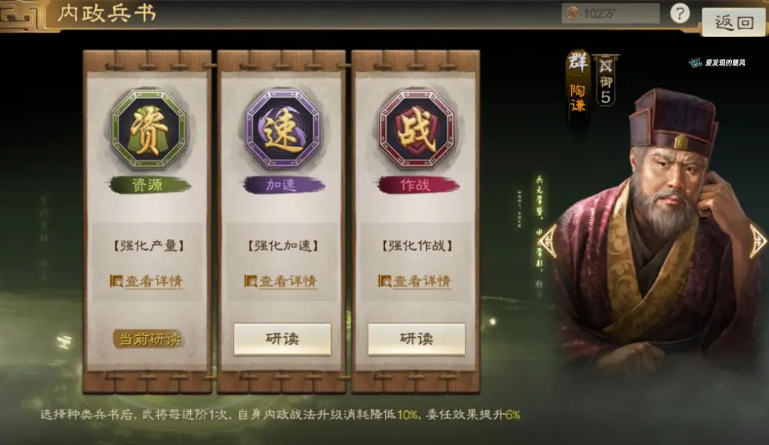 如果有些内政武将换了,记得提前开好内政兵书,需要用铜币,在赛季初期是开不起的,但是内政兵书开了之后可以带到下一个赛季。