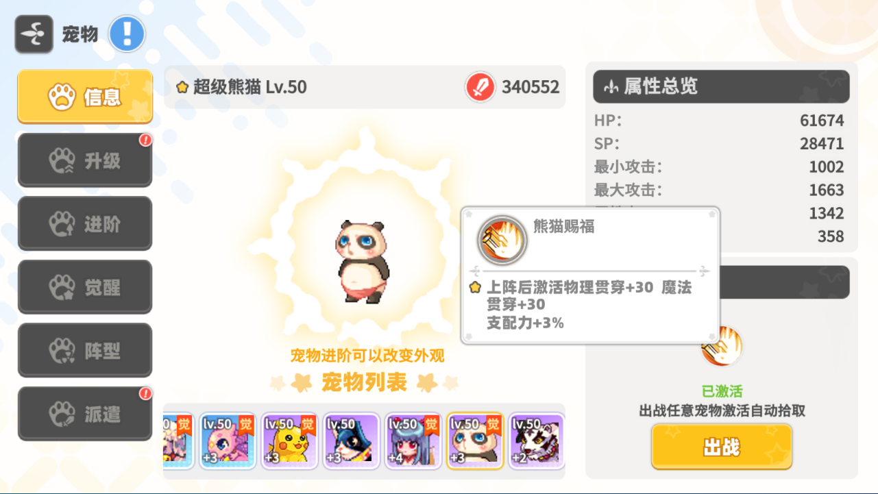 5. 每个宠物上阵后将激活特殊属性,每个宠物都拥有不同的特殊属性