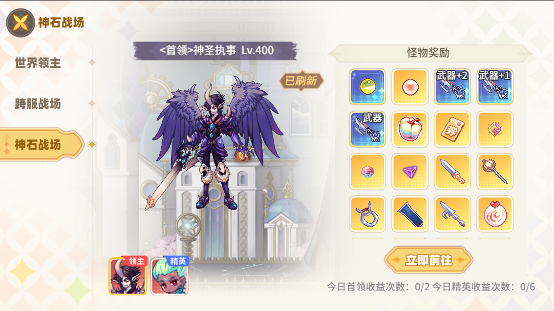 挑战神石战场的首领和精英可获得对应奖励,首领:伤害排名最高的个人或队伍可获得神石首领奖励;精英:最后击杀者可获得精英奖励。玩家每日可挑战神圣战场次数有限,超过次数将无法造成伤害无法获得奖励。