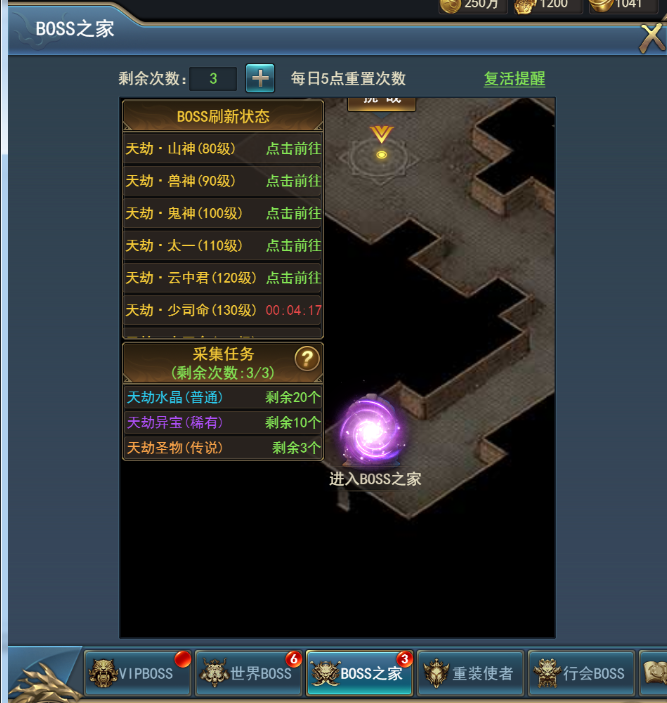 每个VIP BOSS每日只能挑战一次,每日5点将重置可挑战的最高等级的两个VIPBOSS挑战次数。