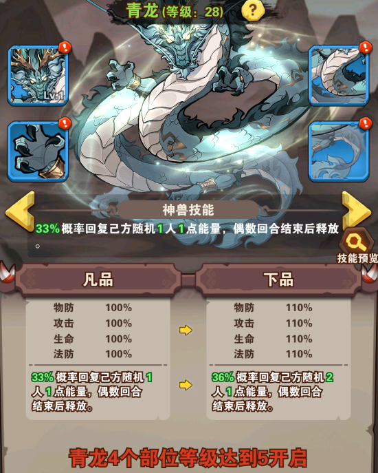 神兽升阶需要消耗大量神兽碎片,如凡品青龙升到下品青龙需要四个部位均达到5级,而每次升级需要10个青龙碎片