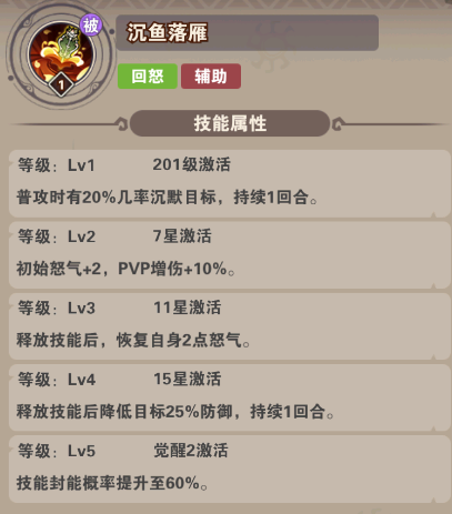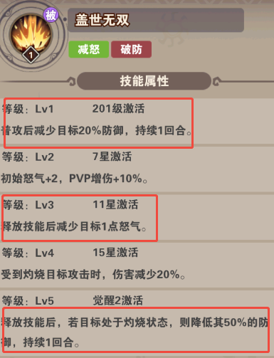 技能:全体aoe技能伤害,被动全体减怒并减防