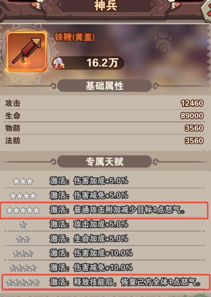 神兵:对能量(怒气)少的额外造成伤害(配合减怒武将、神器镇魂幡减怒可以实现)